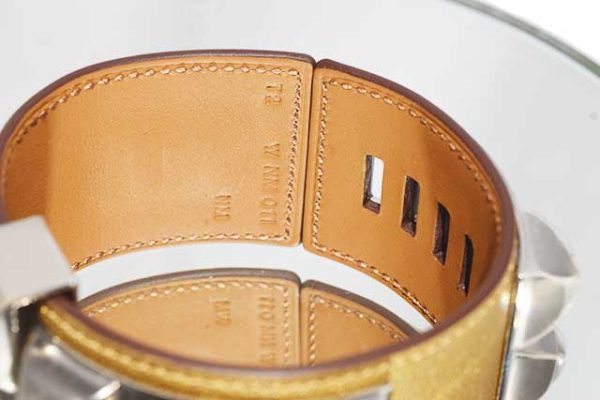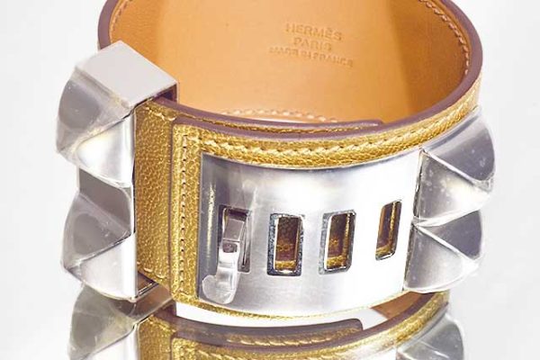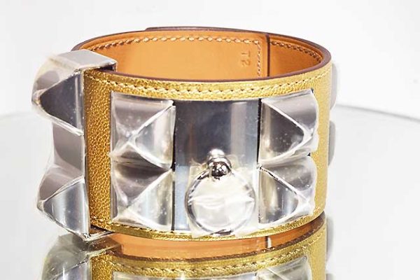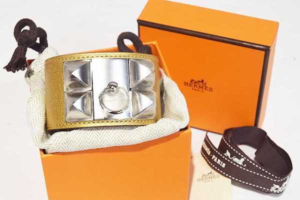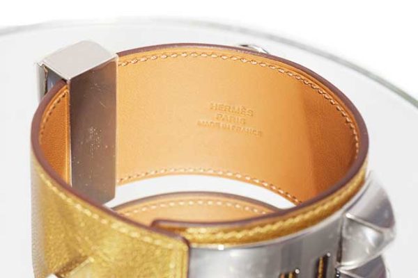 ●エルメスのコリエドシアン ブレスレット バングル!●ドレ×シェーブル×シルバー金具!●W刻印(2024年製造) ●付属品:保管袋、リボン、箱!●ランクは未使用!●金具に保護シールも付いたまま!●試しつけ程度 ●嫌な臭いはしません ●非常にお洒落なメタリックカラーのドレ!