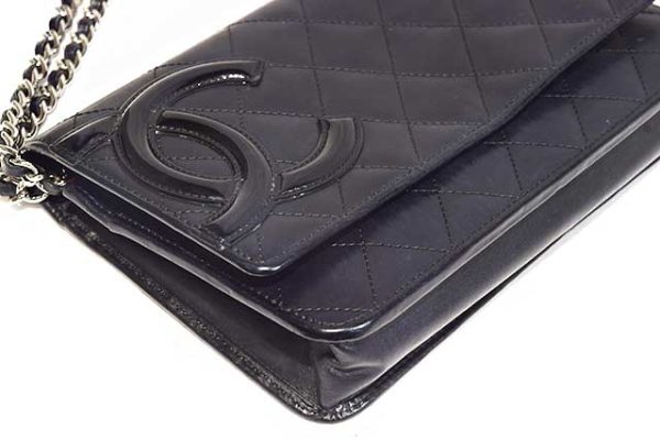 シャネル CHANEL カンボンライン チェーンショルダーウォレット 長財布 ブラック 黒×黒 カーフレザー×パテント S金具 シルバー金具 内側ピンク ココマーク CCマーク 本物 ランクA ショルダーポーチ ショルダー財布