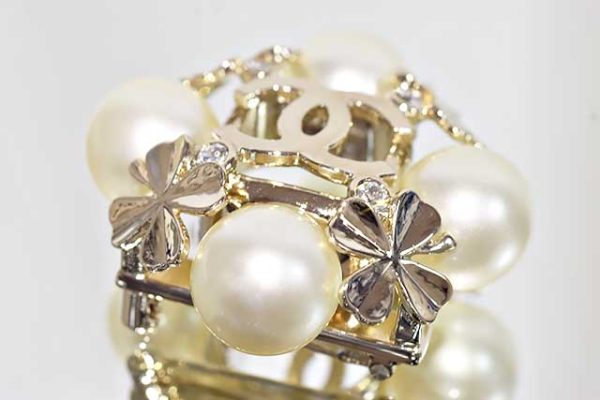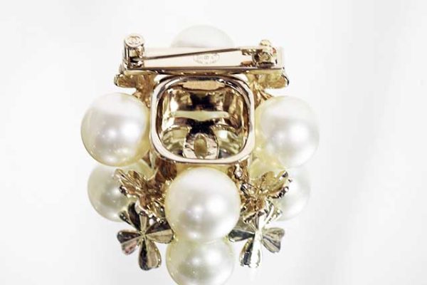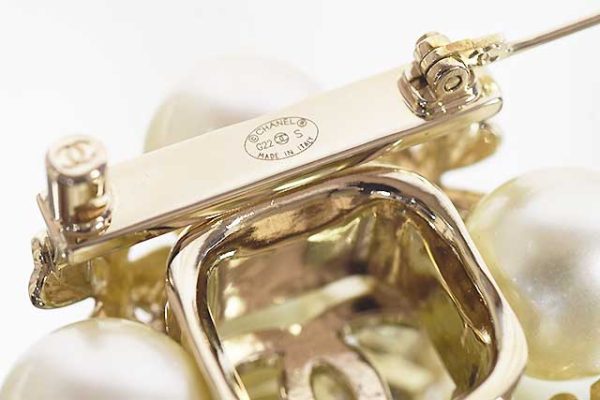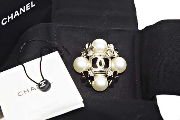 シャネル CHANEL ココマーク ブローチ フェイクパール×GP×ラインストーン 22S クローバー 本物 未使用 箱付き CCマーク